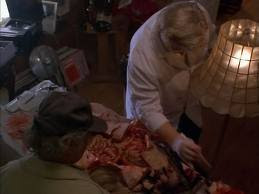 It turns out there are no Strauss's on the island and Dr. Peterson whom delivered John has since passed on. However, his crotchety nurse Lexie Crungle (Jackie Burroughs) is alive and rollin' around in a wheelchair, packin' a shotgun and conveniently resides at the Van Daam mansion that burned down 75 years earlier, killing off the last of the Van Daam clan. I love mean elderly people in films and Mrs. Crungle is a great one. She's a mean ol' bitch and serves only to unload a ton of expository dialogue here, but I loved her scenes just the same, great stuff. It's too bad she doesn't hang around long.
