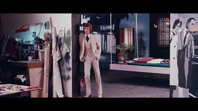While searching for her father she stays at his beach house, a bizarre pad with wall-to-wall murals of life-size figures that stare out at you from the dark, which is quite unsettling. There she restlessly reads from his letters which tells of an encroaching numbness that has been overtaking him. She also encounters a wealthy Portuguese man named Thom (Michael Greer, Summer School Teachers) and his two lovely female companions – Laura (Anitra Ford, Invasion of the Bee Girls) and Toni (Joy Bang, Night of the Cobra Woman), who have been drawn to the seaside spot to explore the local folklore, first encountering Thom interviewing a local wino (Elisha Cook Jr., A Haunted Palace) at a hotel. After showing an interest in her father's work he sets his sights on seducing Arletty, much to the dismay of his current female companions.
