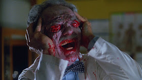 Jeffrey Combs' turn as the mad-scientist is a performance for the ages and his nemesis Dr. Hill is just as fantastic. Hill manages to turn the school's Dean Halsey (Robert Sampson, Robot Jox), against West and Cain using an under explained form of mind-control, he loathes West and is a total perv for Dan's girl Megan, and who wouldn't be, Barbara Crampton is a total babe, and she's still pretty damn hot these days. In the aftermath West and Cain are barred from the med-school but that doesn't stop them from breaking into the morgue and administering re-agent on cadavers which not so unexpectedly goes horribly wrong resulting in the death of the Dean, oops. West doesn't skip a beat and takes advantage of the freshest corpse in the room, injecting the Dean with the re-agent who becomes a brainless zombie, with the Dean being committed to the psychiatric ward under the watch of Dr. Hill who begins to connects the bizarre incident to West's research into brain-death. When confronted by Hill in his laboratory West decapitates the professor with a shovel, but still incapable of curbing his macabre curiosity he uses his re-agent to resuscitate Hill's disembodied head, causing even more problems down the line.