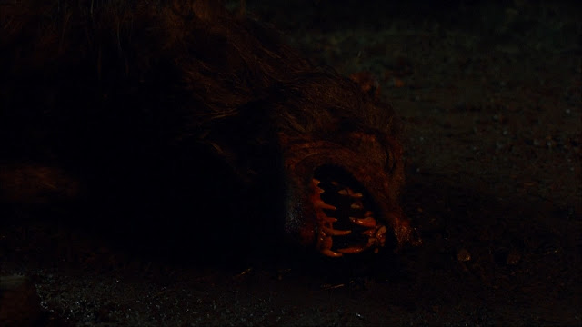 As a character driven slice of horror this is prime stuff with a lot of nuance and some nice character development, however the special effects of the low-budget flick are a bit shaky. Ginger's subtle transformations are handled quite nicely as she grows a tail and her nails grow, canine teeth emerge, eer eyes change color and facial features are slightly altered and she develops multiple nipples along her abdomen. All that was nicely done but the final transformation are not the film's strength, I did not care for the hairless werewolf look, it was pretty rubbery looking, but this is not your standard issue werewolf flick and it manages to rise above it's shortcomings. The characters are what drive the story which is good as the shaved-cat sort of rubber suit was awful, plus we get some fun, squeamish body-horror moments peppered throughout though- this is after all a movie about transformation.