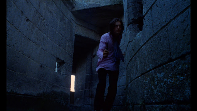 This was director Jean Rollin's third film and would prove to the film that established his particular eurocult vibe and aesthetic, which he achieved with the help of cinematographer Jean-Jacques Renon, and a tasty psyche-rock score by Acanthus that sounds like first they could be outtakes from an early Syd Barret era Pink Floyd album. The narrative is more moody atmosphere than any intricate plot, it's basically an shabby erotic lesbian vampire flick with artful and enigmatic visuals steeped in layered colored lighting with retina-searing reds and striking blues. It might be near plotless but it is a sumptuous looking bit of low-budget softcore with eye-popping colors and creepy Gothic castle eeriness. I've never thought the acting was particaurly great with this one, it has a certain off-kilter campiness to it, with the cousin vampires having a bizarre effeminate camp-factor to their performance that I actually quite love, their former hippie vampire hunters turned bloodsuckers schtick it a hoot.